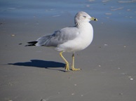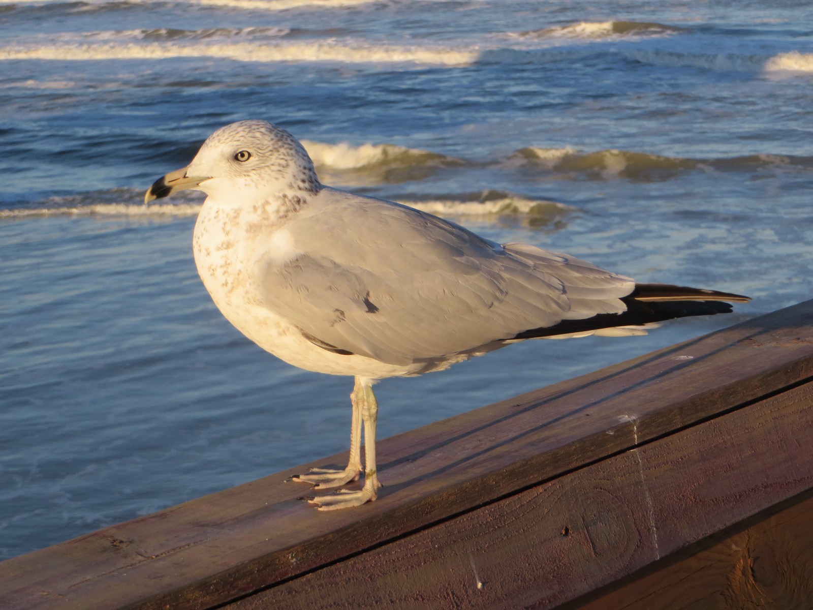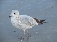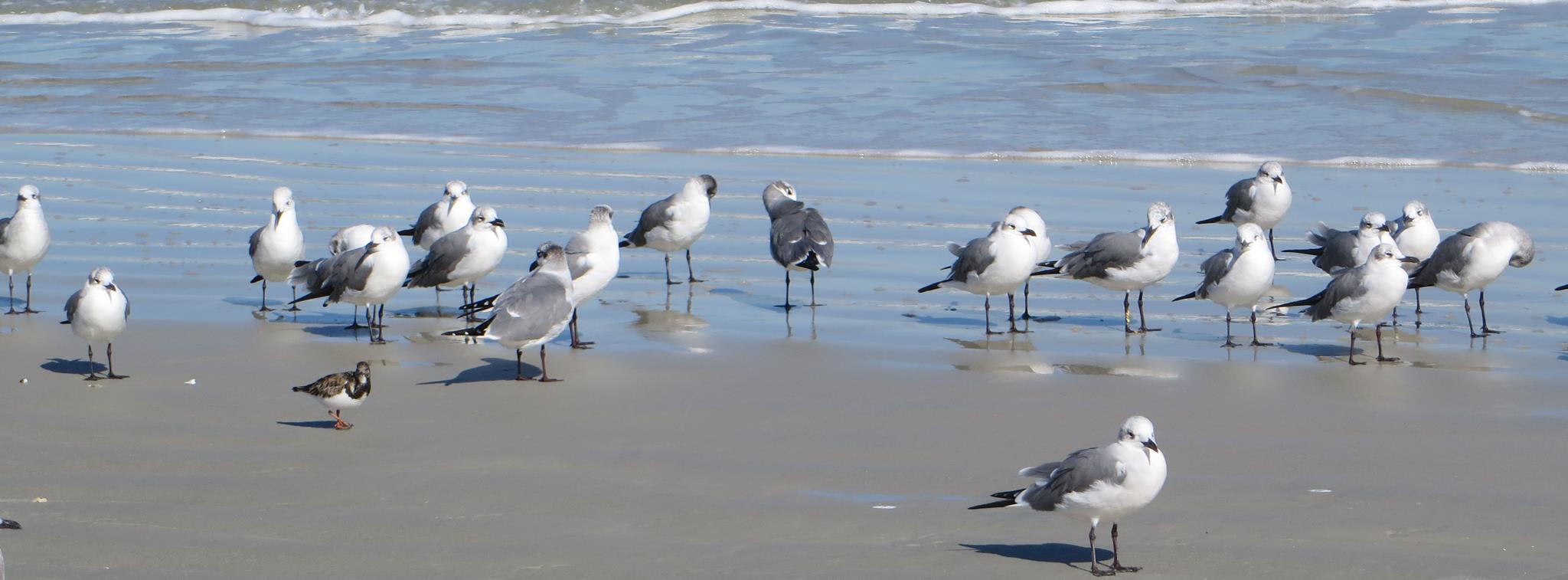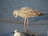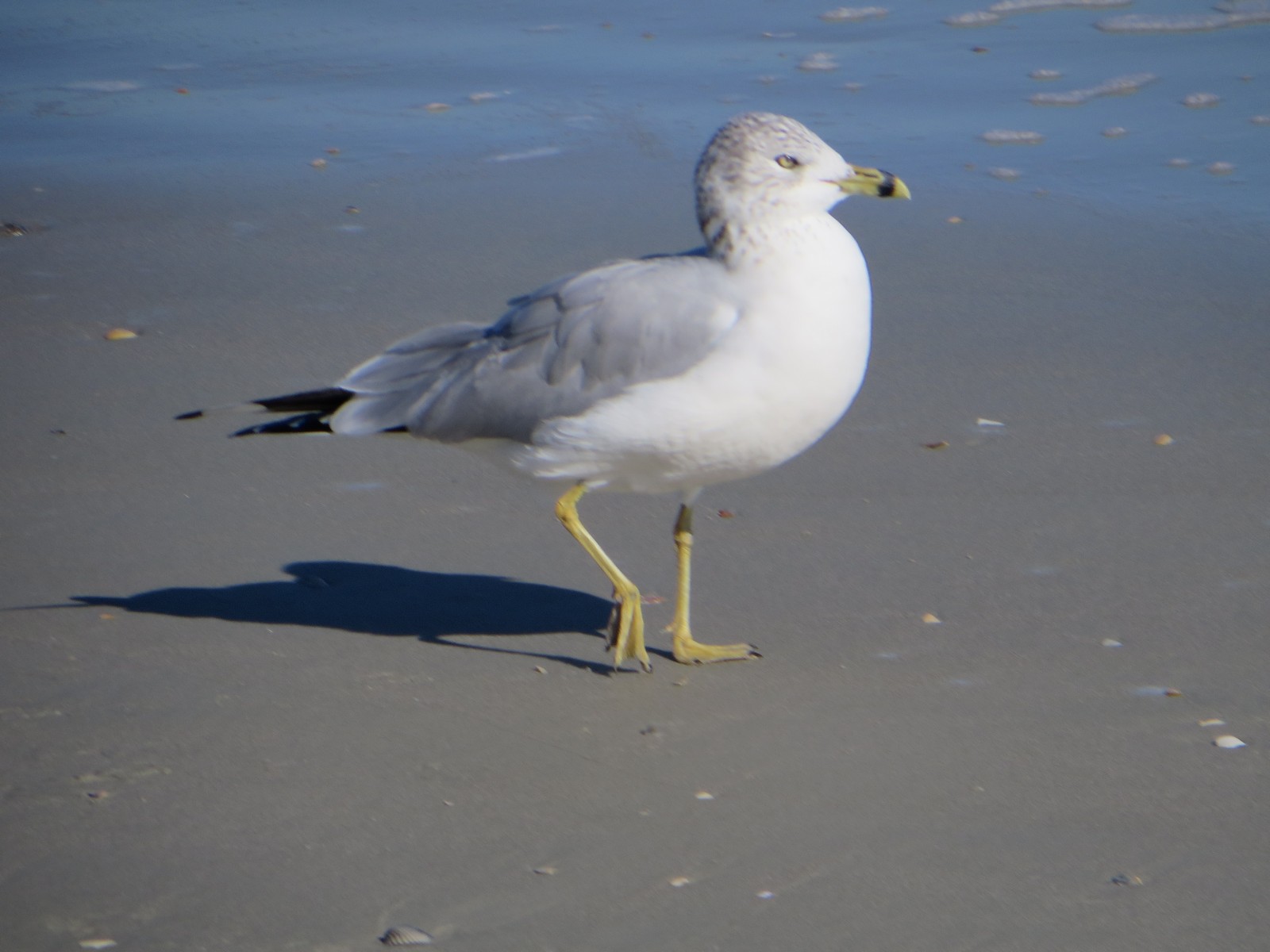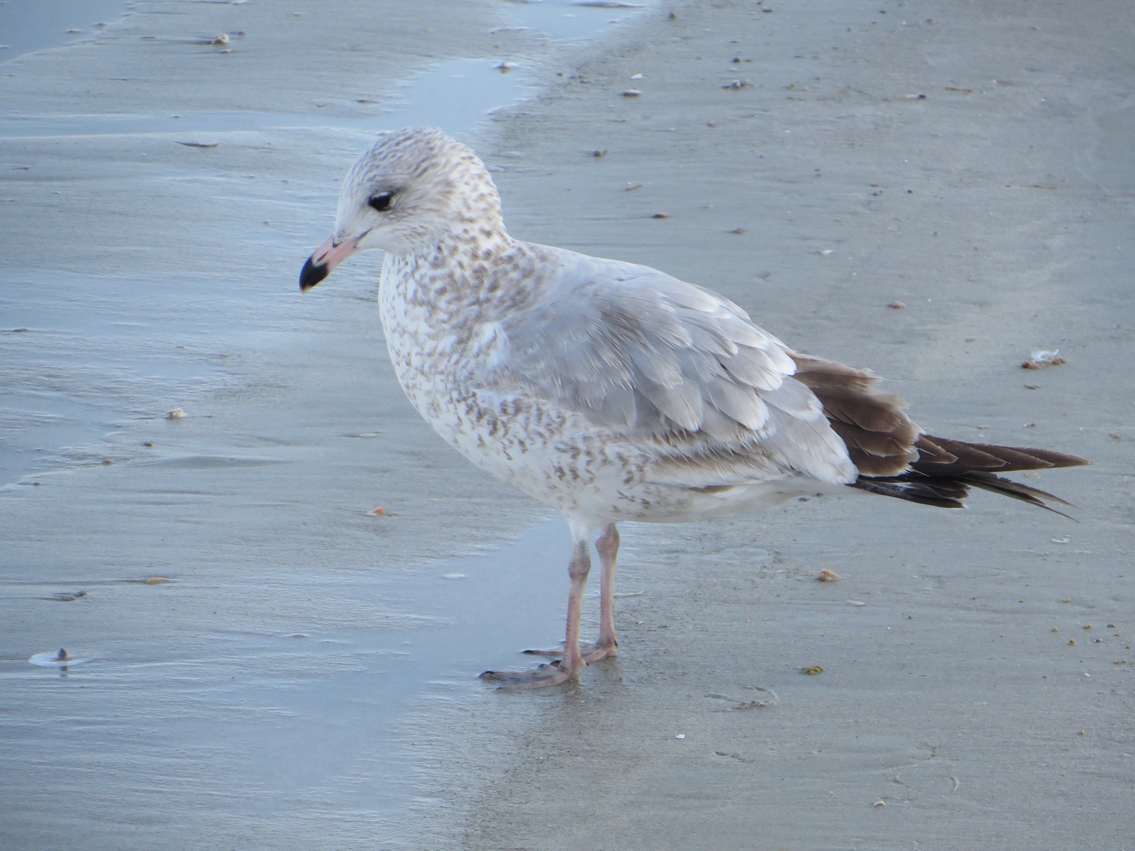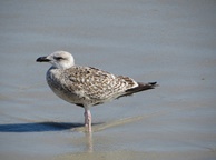 Während diese beiden Gruppen meist auf dem Sand kurz vor den Wellen stehen, sieht man vereinzelte Möwen im flachen Wasser stehen, die durch ihre Größe auffallen, sie wirken fast wie große Hühner. Es ist die amerikanische Silbermöwe (American Herring Gull), die ob jung oder alt leicht an ihrer herausragenden Größe und den fleischfarbenen Beinen zu erkennen ist. Die ausgewachsenen Vögel sind farblich ähnlich wie die beiden anderen Möwengruppen, grauer Rücken, weiß gepunkteter Schwanz, weißer Bauch, nur die Beine sind fleischfarben. Und merkwürdigerweise gibt es sehr wenige ausgewachsene Tiere, sondern viel mehr Juvenile, die bräunlich gesprenkelt sind.