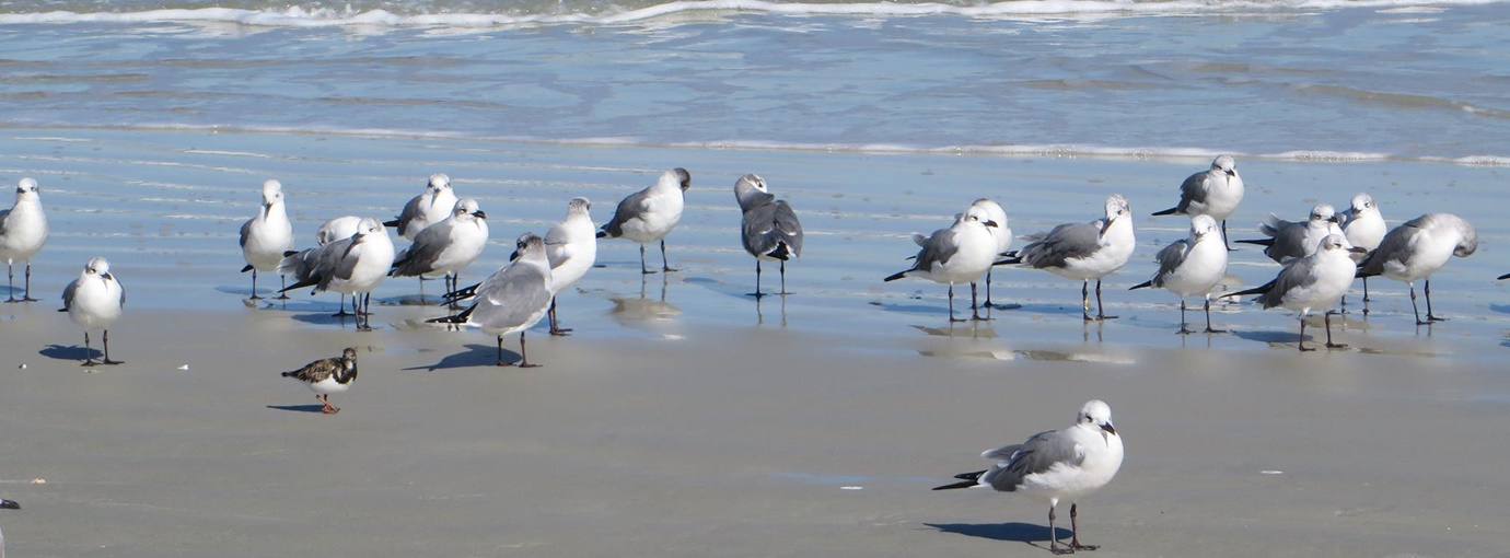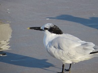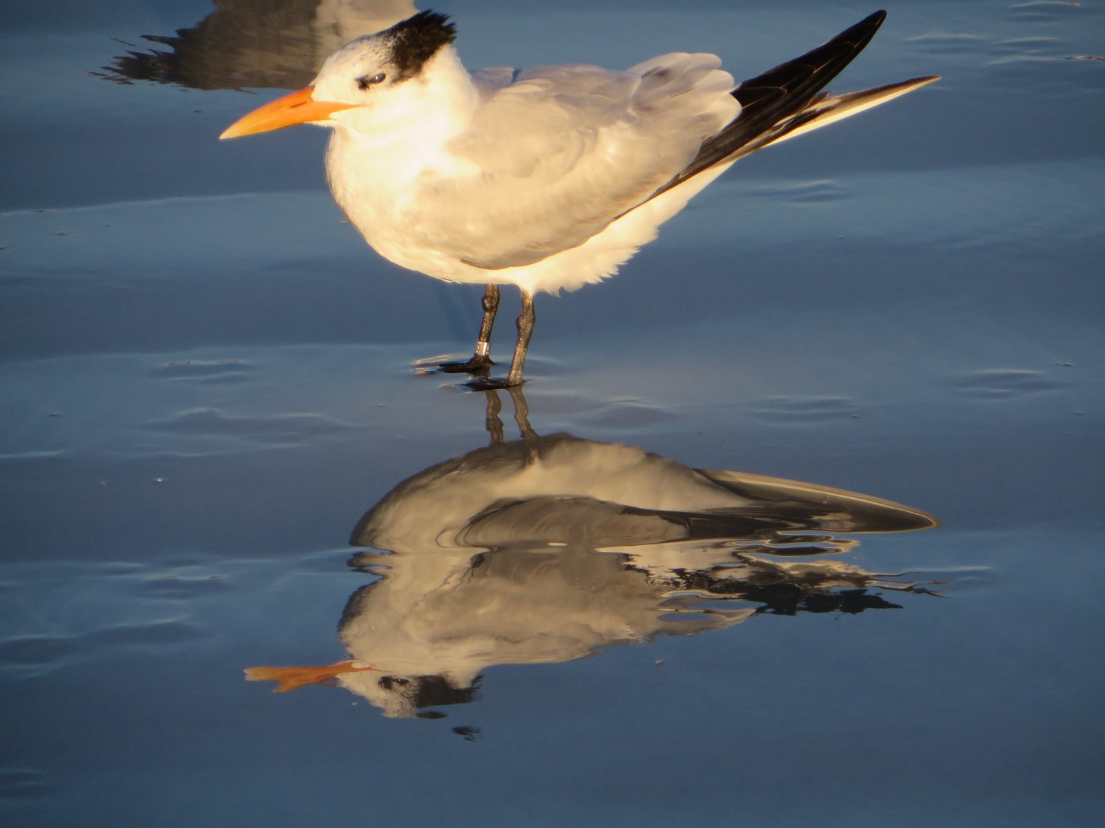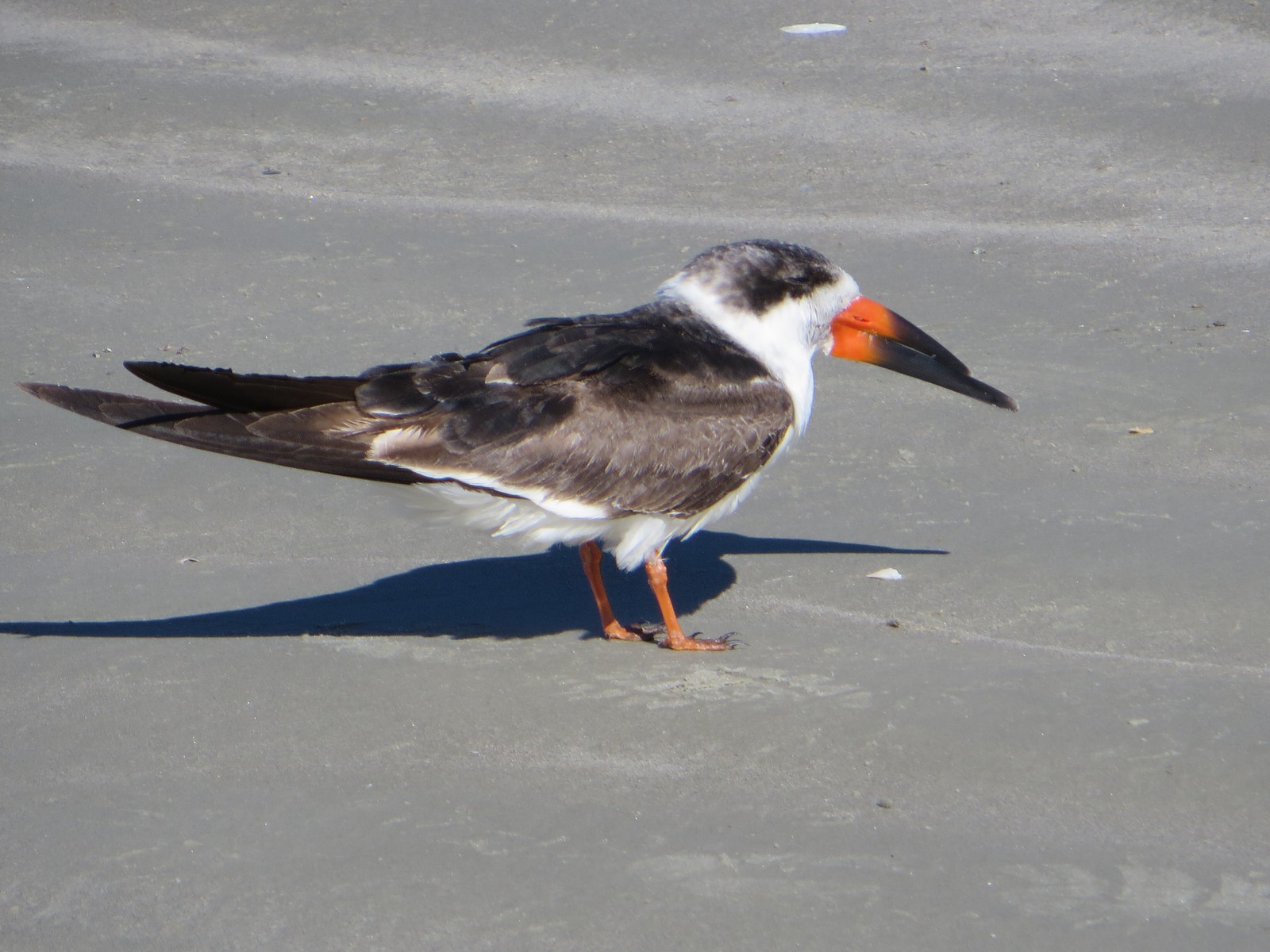 Neben diesen drei Möwenarten gibt es noch Seeschwalben, allerdings in geringerer Anzahl. Die Königsseeschwalbe ist leicht an ihrem leuchtend orangefarbenen Schnabel und der wild aussehende schwarzen Haube zu erkennen und kommt in kleinen Gruppen vor. Sehr selten zu Besuch, da sie eher an der Westküste zu Hause ist, ist die Brandseeschwalbe . Auch sie hat die schwarze Haube und ähnliche Größe und Form wie die Königsseeschwalbe, ist aber der Schnabel ist schwarz und macht sie sehr viel unscheinbarer. Trotz der gelben Spitze. Und dann gibt es noch einen richtigen Exoten, den Schwarzmantel-Scherenschnabel . Er hält sich vor allem bei Ponce Inlet, am Ausgang des Halifax River zum Atlantik auf. Ein sehr hübscher Kerl in Möwengröße, der sofort an seinem großen Schnabel in orange und schwarz zu erkennen ist, auch die Beine sind leuchtend orange.